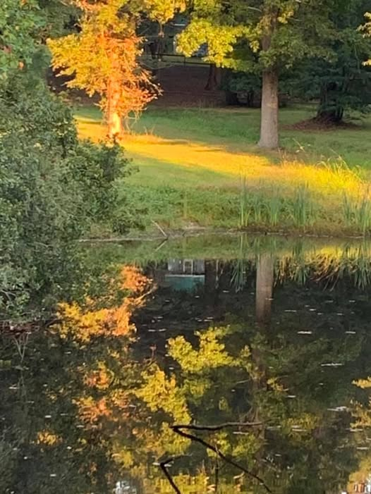 wet grass glistens in shadows