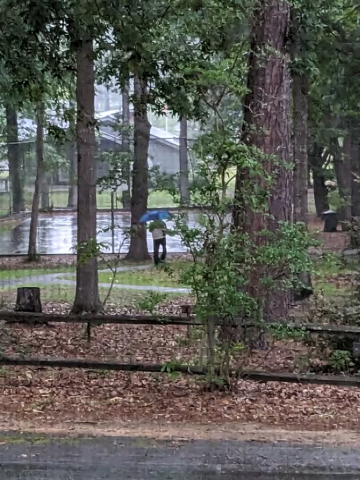 I put on old shoes and a rain suit, grab the umbrella from its place on the porch and walk in the park.